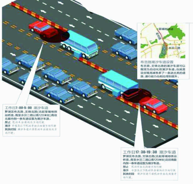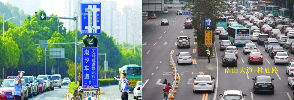 (3)潮汐车道周边应设置公告牌,明确指示潮汐车道位置,并清晰告知潮汐车道运行时间段及运行方向。