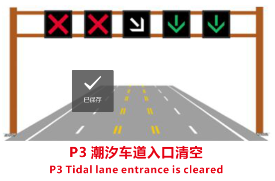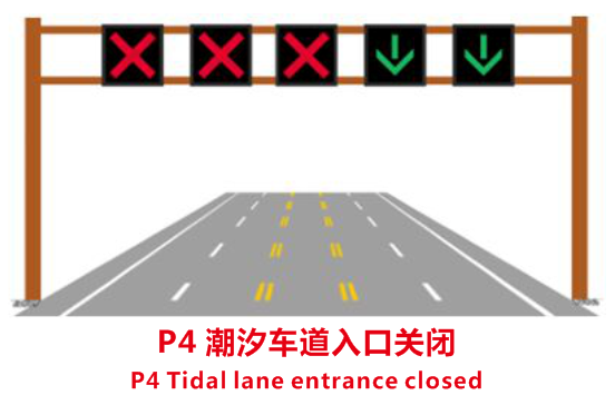(2)潮汐车道路段起点前适当位置应设置预告、告示或警告标志,提醒驾驶人注意前方为潮汐车道,如P1所示。
