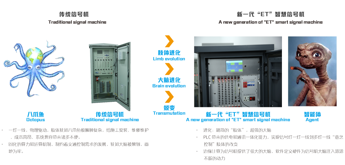 新一代 ET 智慧交通信号控制机,对于传统的交通信号控制机而言,其工作模式采用的是“一灯一线”物力驱动的模式,有多少个信号灯就需要有多少条驱动线缆,对于当前控制复杂度越来越高的路口,需要大量的线缆,传统信号机的控制犹如“八爪鱼”般肢体臃肿,线缆的施工安装、维修维护、兼容扩展、建设成本给智能交通的发展带来越来越重的压力。而对于路口的交通控制策略,也禁锢在传统信号控制内部,不能灵活调整。新一代 ET 智慧信号机引入华为的 PLC-IOT 技术后,原有的“一灯一线”模式进化成“多灯一线”的“意念控制”;将原有的固化控制算法大脑进化成“边缘技术载体”的扩展大脑,用软件定义硬件的方式实现信号控制应用的演变。